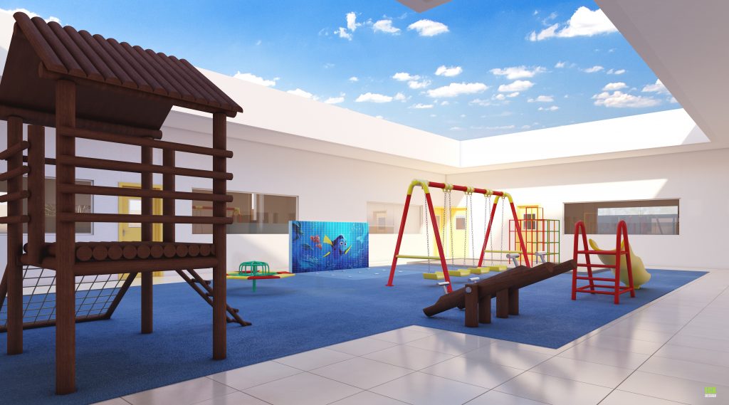 Infraestrutura: a escola conta com dois berçários com solários e salas de soninhos, 6 salas de aula com banheiro integrado, área de amamentação e enfermagem, sala de psicomotricidade, área de recreação com brinquedos pedagógicos e aquaplay, refeitório e cozinha educativa, recuo com área de acesso para pedestres e veículos, auditório e capela, salas para preceptorias, biblioteca, área independente para professores com cozinha, sala de descanso e reuniões.