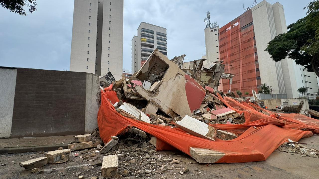 Foram utilizados 50 quilos de explosivos para garantir o desabamento controlado da estrutura, que gerou cerca de nove toneladas de entulhos. A remoção já começou.