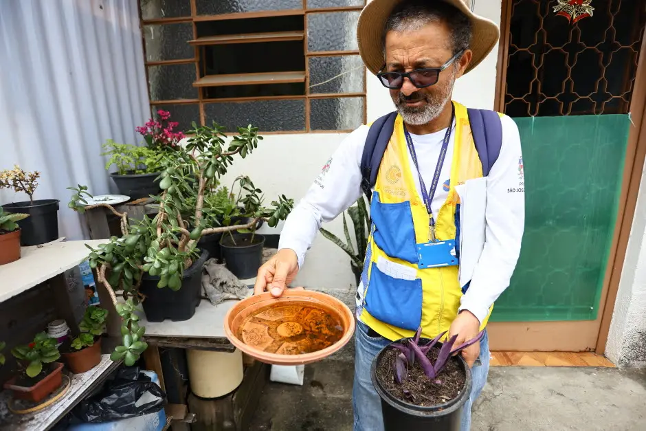Com o calor e as chuvas do verão, a proliferação do mosquito aumenta. Por isso, a orientação é eliminar água parada, evitar pratinhos embaixo de plantas, manter caixas-d’água fechadas e permitir a entrada dos agentes de combate às endemias para vistoria.
