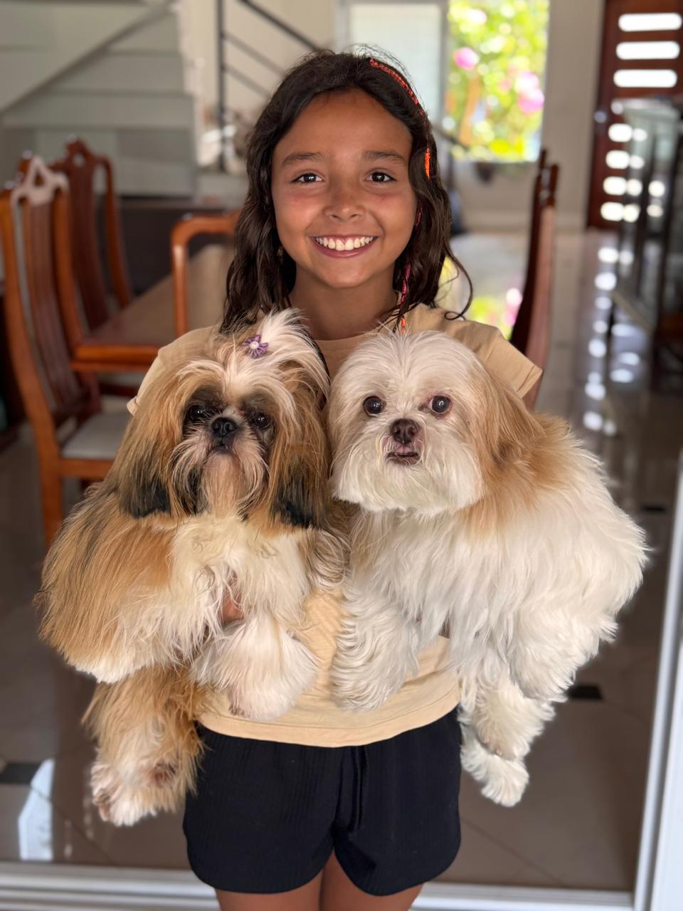 No meu aniversário de 2024, meu pai adotou a Cacau, uma filhotinha de três meses, a mesma idade que o Toddy tinha quando chegou à nossa casa. O mais branquinho é o Toddy e a marronzinha é a Cacau.