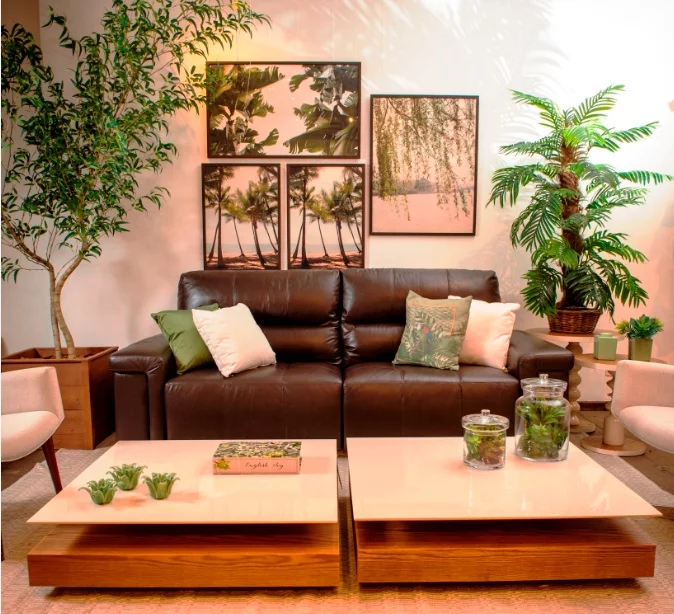 Nesse estilo de decoração temos como destaque as folhagens, de vários tamanhos, formas, cores e texturas. Já as flores com suas pétalas podem aparecer como leves toques de cor, mas as folhas verdes são as verdadeiras protagonistas. E seguindo essa linha vale desde paredes verdes e árvores frutíferas dentro de casa até simples vasinhos juntinhos em aparadores e prateleiras. Para quem não leva muito jeito para cuidar de plantas, temos as mais resistentes como cactos e suculentas como uma ótima alternativa.